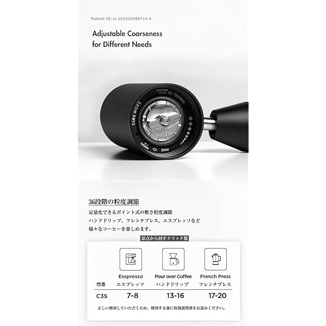 簡単な調節機能 |ダイヤルのクリックにより粒度を36段階で調節でき、ハンドドリップ 、フレンチプレス、エスプレッソなど様々なコーヒーを楽しめます。