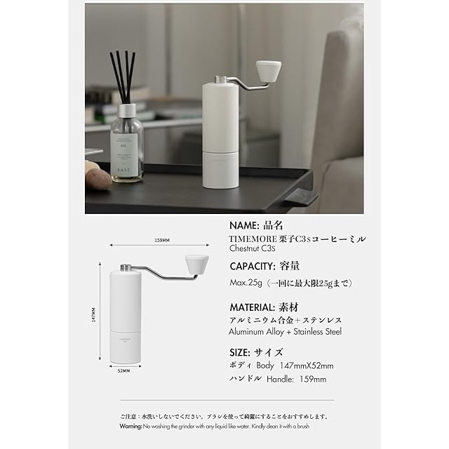 基本情報 |TIMEMORE コーヒーミル栗子C3s サイズ:ボディー:147*52mm 重量:約530g。セット内容:ミル本体、ブラシ付き、専用収納袋づき。*水で洗わないで、付属のブラシを使ってお手入れお願いします。
