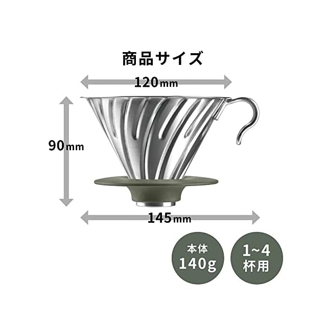 【商品詳細】本体サイズ:幅14.5×奥行12.0×高9.0cm、口径12.0cm、容量:1~4杯用、本体重量:140g、本体材質:本体/ステンレス、ホルダー/シリコーンゴム、日本製