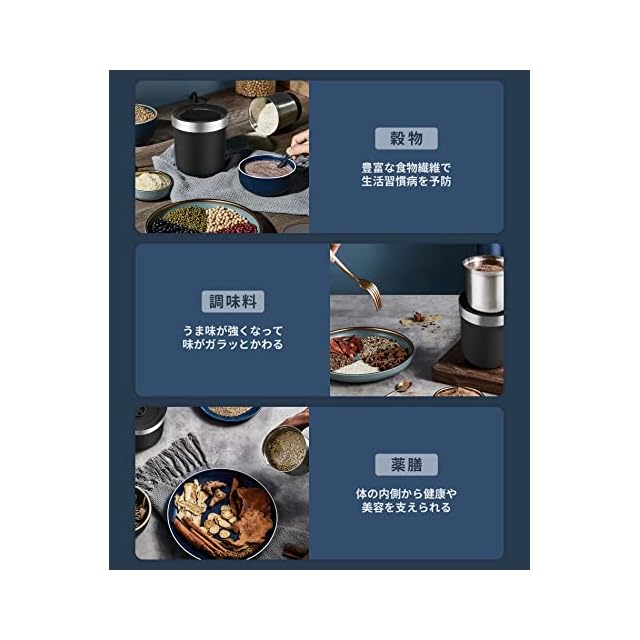 【1台多役】コーヒーミル電動はコーヒー豆に限らず、お茶、豆類、米、八角、唐辛子、ピーマン、胡椒、ナッツ、香料、イワシの干物、薬材・・・多種多様なの食材や食べ物等、簡単に研磨することができます。ファッションなデザインと高機能性は、コーヒー愛好家や女性への最適なプレゼントとしてお勧め致します。