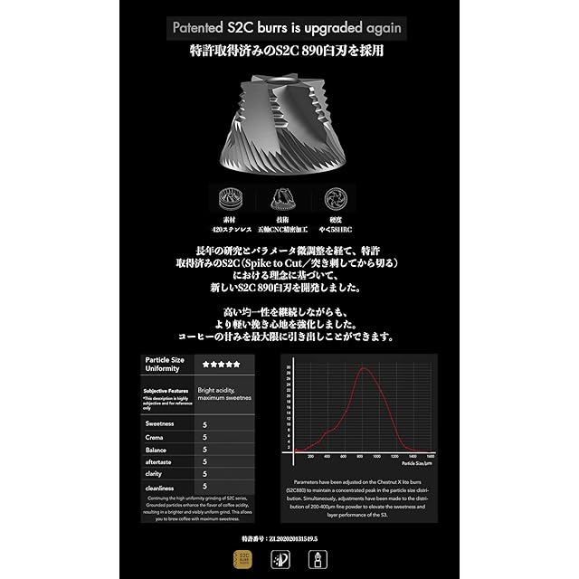 切れ味の良い刃| 従来のコーヒーミルとは異なり新しいS2C890臼刃が搭載されており、豆が一貫して最適な風味を引き出すだけでなく、素早く挽けるように進化しました。均一な挽目を実現し、微粉の発生量も最小限に抑えて、豆の味を損ないません。