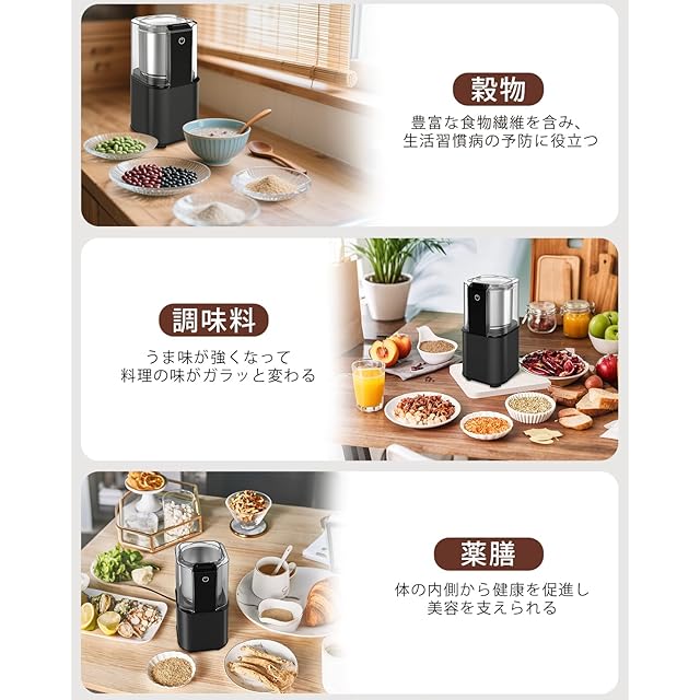 ☕【1台多役&多様な用途】このコーヒーミルは、コーヒー豆だけでなく、お茶、豆類、米、八角、唐辛子、ピーマン、胡椒、ナッツ、香料、イワシの干物、薬材などのスパイスや穀物も簡単に研磨することができます。朝は香り高いコーヒー豆を、昼は自分好みの茶葉や香辛料を挽いて、穀物、豆類、ナッツ類などを活用することで、料理の幅が広がり、より健康的な食事作りが可能になります。多用途コーヒーグラインダーだからこそ、これ一台でキッチンがすっきり整い、手間もかかりません。