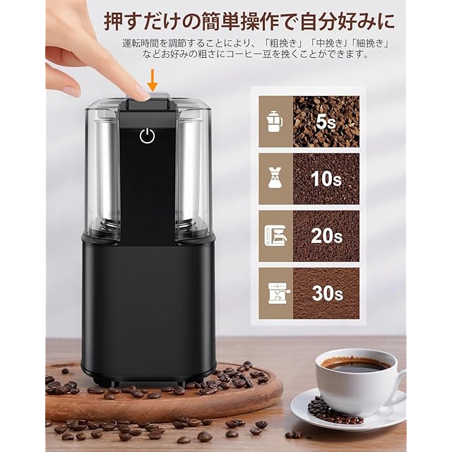 ☕【押すだけの簡単操作で自分好みに】コーヒー豆を入れてボタンを押すだけの簡单操作、誰でも簡単に使える電動コーヒーグラインダーです。運転時間を調節することにより、「粗挽き」「中挽きJ「細挽き」などお好みの粗さにコーヒー豆を挽くことができます。透明なカバーが付いているので、挽いているコーヒー豆の粗さを簡単に確認できます。粗挽きはすっきりとした味わい、細挽きは濃厚でコクのある味わいになりやすいです。コーヒー豆を挽く粗さによって、風味や味わいが大きく変わるため、好みに合わせて挽き目を調整することで、より美味しくコーヒーを楽しむことができます。
