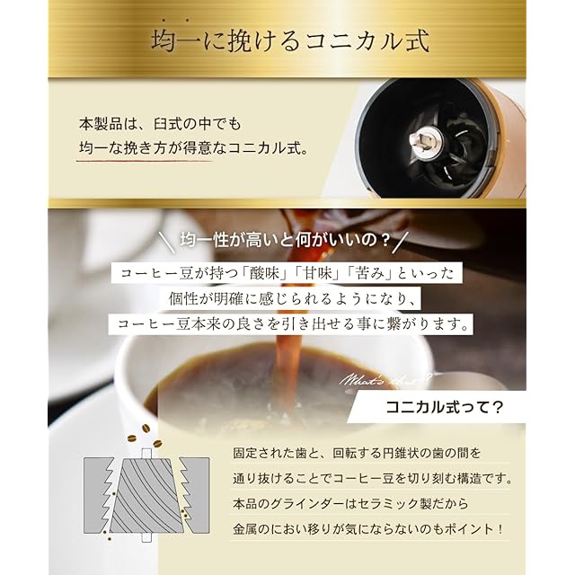✅『均一に挽けるコニカル式』臼式の中でも均一な挽き方が得意なコニカル式を採用。コーヒー豆が持つ本来の良さを引き出す事に繋がります。『セラミック臼刃』セラミック刃のグラインダーだから、金属のにおい移りが気になりにくいのもポイント。
