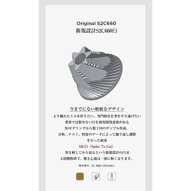 2.【優れた刃】:S2C (Spike to Cut/突き刺してから切る) という新規設計の臼刃です。五軸CNC高精度加工が施された、硬度55-58HRCの臼刃を採用。均一な挽目を実現し、同時に微粉の発生も最小限に抑えるので、雑味が少なくクリアな味わいをお楽しみいただけます。