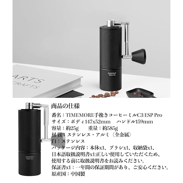 1.ブランド:TIMEMORE 型番:栗子C3 ESP Pro手挽きコーヒーミル 材 質 :ステンレス・アルミ(全金属) 刃:ステンレス サイズ:本体147x52mm 容 量 :約25g 重 量 :約585g