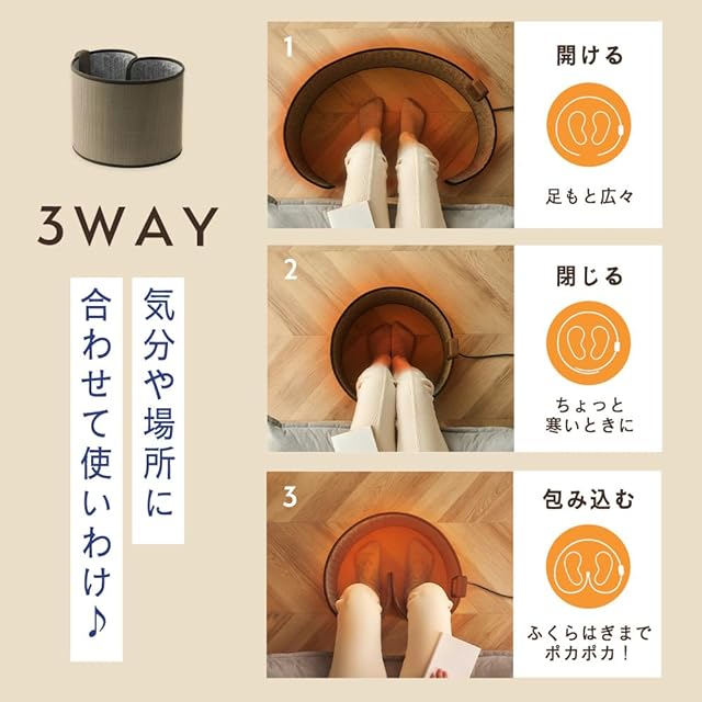【気分や場所に合わせて使い分け♪3WAY】内蔵マグネットで簡単に開閉&使い分け。1:開ける/足元広々で席を立つ時も邪魔になりにくい。2:閉じる/ちょっと寒い時は熱を閉じ込めて両足をあたため。3:足をそれぞれ包み込んで閉じる/少ない電力でも素早くふくらはぎまでポカポカに!【「ぐるっと」だから省エネ!】電気代は1時間たったの約2.1円。寒いけどエアコンをつけるほどでもない…なんてときにもピッタリ。(※20℃の環境のもと「弱」モードで1時間使用した時の電気代の目安。電力目安料金は、全国家庭電気製品公正取引協議会電力料金目安単価31円/kWh(税込)[令和4年7月改定]で算出。電気代は、お客様と電気会社との契約内容や、使用状況[運転モード]により変動します。)