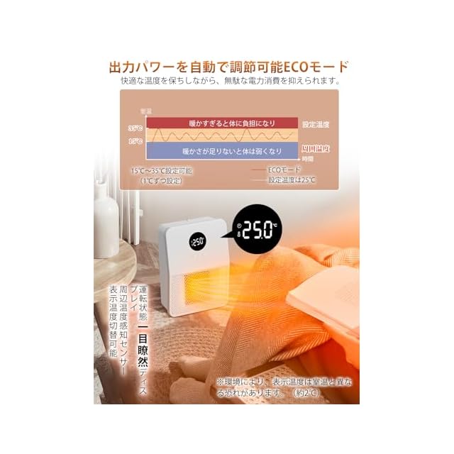 【風量3段階搭載・ECO運転機能】この最新型電気ファンヒーターは「高温風1200W」、「低温風800W」、「自然風8W」と「ECOモード」四つの温度モードが搭載されます。エコモードでは、温度は15℃~35℃まで1℃ごとに設定可能、また周囲温度に合わせて、出力レベルを自動的に切り替え、人体に快適な温度をキープしながら省エネに運転にします。セラミックヒーターの電源を切った後、ファンが引き続き運転「30秒送風散熱機能」、内部の熱量が完全に冷却して不意な怪我を防ぐ効果があります。