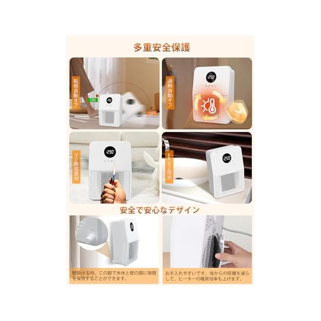 【転倒OFF・二重過熱保護・切り忘れ防止・V0級難燃ボディ】多重保護機能搭載、安全至上のプロ仕様 ①転倒OFF:地震などの意外な原因で転倒すると、電源が自動的に切ります。②二重過熱保護:内部に温度センサーを搭載し、高温と低温二つの部分の温度を感知して、温度が高過ぎた時に、電気ヒーターが自動的に停止する。③消し忘れ防止:運転してから6時間後に自動的に停止します。外出の時、電源を消したかの不安は必要ない。④難燃性:セラミックヒーターのボディはV0級難燃素材を採用し、安全性さらに固める。⑤正規品:日本国内電気用品安全法(PSE)認証済み