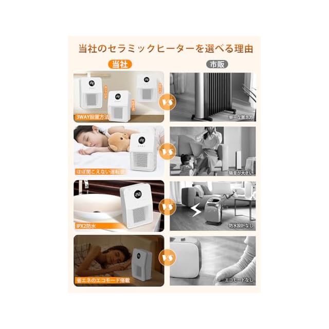 【縦置き・吊り下げ式・壁掛け式・3way設置可能・IPX2防滴】弊社のセラミックヒーターは縦置き&吊り下げ&壁掛けの3WAYで使えます。部屋のレイアウトにより、一番省スペースの方法で設置できます。その上、IPX2の防滴等級で、少しい水をかけしまいましても問題なく使えます。これらの仕様のかけで、市販の同類品より使用場所の幅が広くなります。寝室、リビングだけではなく、脱衣所または洗面所でも活躍します。冬にヒートショック対策として最適!
