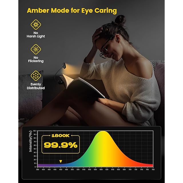 ✨【目に優しいアンバーライト】寝る前に読書を楽しむ読書家のために、このブックライトは1800Kアンバーモードを搭載しました。1800Kはしっかりと目を保護し、長時間読書しても目が疲れることがありません。また、このベッドライトは99.99%のブルーライトをカットしてくれ、安らかで甘い睡眠が取れます。過酷な光、ちらつき、まぶしくありません。リラックスしたベッドでの読書時間が過ごせる最適なアンバー読書ライトになります。