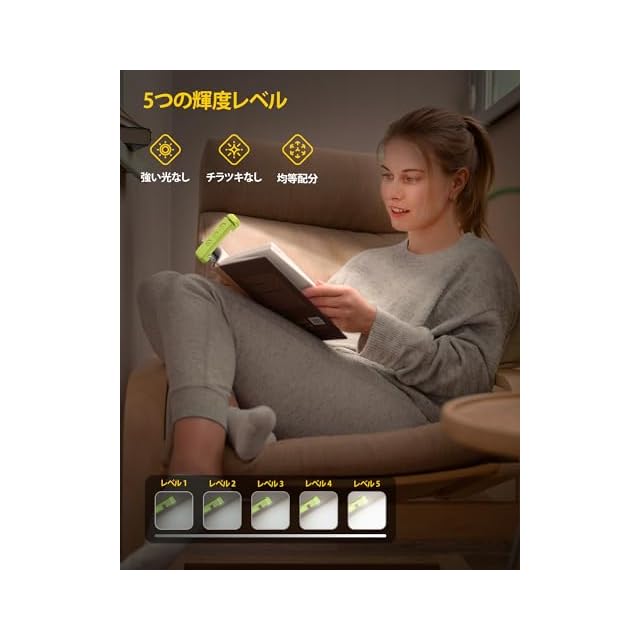 [5段階の明るさ調節可] この小型ブックライトは5段階の明るさがあり、目に合ったレベルを選択できます。 読書用ブックライトを使えば、お気に入りの明るさを設定できます。 さらに、科学的に5 個のLEDビーズが取り付けられているので、読書ページに光を均等に分散できます。 十分な明るさで、 近くの人を邪魔しないほど薄暗いです。 ちらつきや強い光はありません。