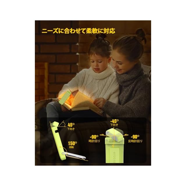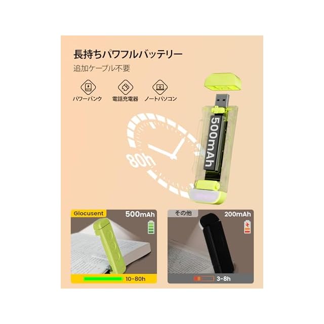 [USB充電式 & 長持ち] 標準のUSB充電式で、コンピューター、アダプター、USBコンセントのUSBポートと互換性があります。 この充電式ブックライトには500mAhバッテリーが内蔵されており、10~80時間の読み取り時間を提供します (明るさ設定によります)。 そのため、照明設定に基づいて 1 日30 分を読むと、 20 日から3 ヶ月間読むことができます。 また、残量を表示する4つの電源インジケータがあります。