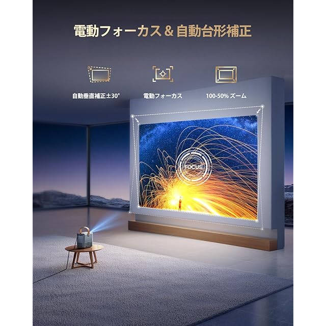【自動台形補正&電動フォーカス&100%-50%ズーム】この小型プロジェクターは最新技術を採用し、面倒なフォーカスの調整なしで、ワンボタンリモートフォーカスで、瞬時に鮮明な画像を実現できます。垂直対応の自動台形補正技術で、自動的に綺麗な長方形の投影映像を得ることができます。50%~100%ズーム機能により、プロジェクターを移動させることなく画面サイズを簡単に調整でき、様々なエンターテインメントシーンのニーズに対応します。1.24:1の投影比により、わずか2.5メートルの距離で100インチの迫力ある映像の大画面を実現できます。狭い空間でもIMAX映画のような体験を実現します。