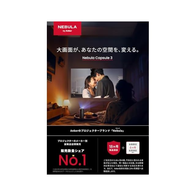 大人気Capsule llの次世代モデル:人気モデル「Nebula (ネビュラ) Capsule ll」のコンパクトさはそのままに、あらゆる面で進化した、モバイルプロジェクターの決定版。 GoogleTVの搭載:より優れた操作性を実現し、コンテンツのおすすめ機能を新たに搭載。またリモコン上のNetflixボタンを押せば、公式アプリへ直接飛ぶことができ、操作はよりスムーズに。 100インチから、120インチの大画面に拡大:片手に収まる500ml缶以下のサイズというコンパクトさからは想像できない、最大120インチの大画面投影が可能に。 より鮮明な映像美を実現:HDからフルHDへアップグレード。高解像度で細部までクリアにみえ、質感までリアルに伝わります。HDR10対応で、表現が難しいとされる黒色も白色も深みのある色合いに。