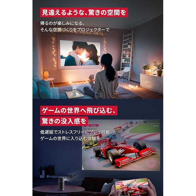 【コンパクトでも、驚きの映像美】ハイビジョン (720p) の高画質で、コンパクトさからは想像できない映像美。最大100インチの大画面投影で、どんなお部屋でも特別なシアターに。