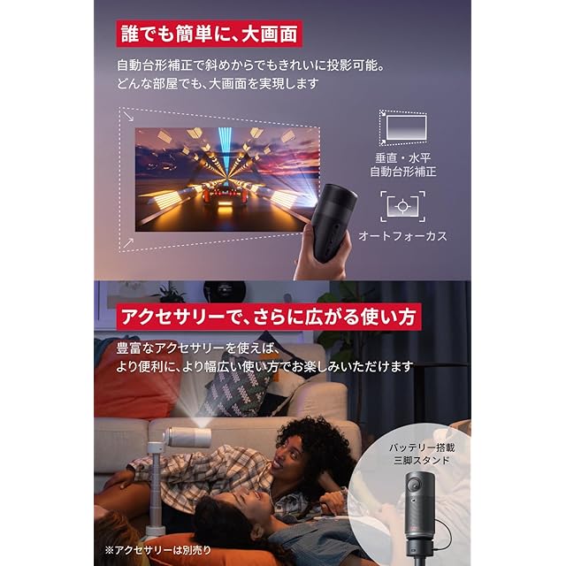 【誰でも簡単に、大画面】自動台形補正で斜めからでも簡単に投影可能。置き場所に悩むようなお部屋でも、大画面を実現。別売りの豊富なアクセサリーを使えば、角度調節も快適に。天井投影もお楽しみいただけます。