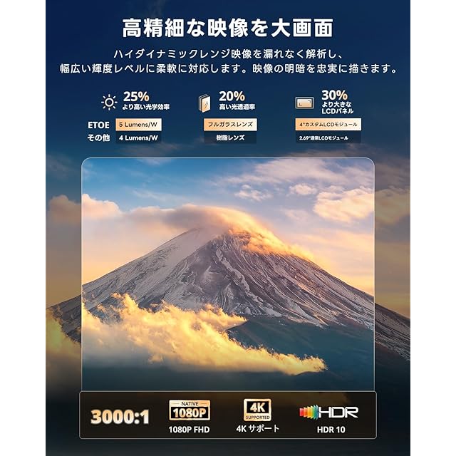 ②【1080pフルHD+HDR10、迫力の高画質】明暗差の表現力が向上し、よりリアルで奥行きのある映像を再現します。細部まで鮮明で色彩豊かな映像は、映画、アニメ、スポーツ観戦、ゲームなどあらゆるコンテンツを臨場感たっぷりの大画面で楽しめます。