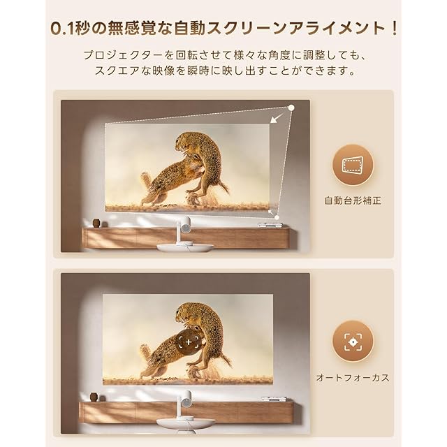 ③【オートフォーカス&自動台形補正】電源を入れると自動でピント調整され、さらに自動台形補正機能が映像の歪みを瞬時に補正。設置後の調整が不要で、誰でも簡単に理想の映像が手に入ります。