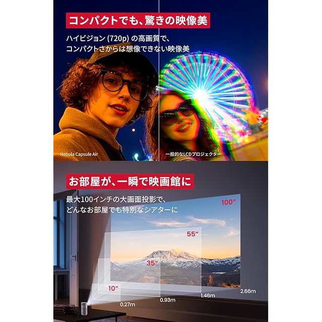 Nebula Capsule Air びっくりするほどミニサイズ:大人気のNebula Capsuleシリーズから世界最小※Google TV搭載プロジェクターが誕生。コンパクトで迫力のある映像を。※2025年1月時点 Anker調べ。 Google TV搭載で、人気動画サービスを楽しめる:Netflix、YouTube、 Prime Videoなど10,000以上のアプリを利用可能。リモコンからワンタッチで簡単起動。 コンパクトでも、驚きの映像美:ハイビジョン (720p) の高画質で、コンパクトさからは想像できない映像美。最大100インチの大画面投影で、どんなお部屋でも特別なシアターに。 誰でも簡単に、大画面:自動台形補正で斜めからでもきれいに投影可能。どんな部屋でも、大画面を実現。豊富なアクセサリーを使えば、角度調整も快適に。天井投影もお楽しみいただけます。