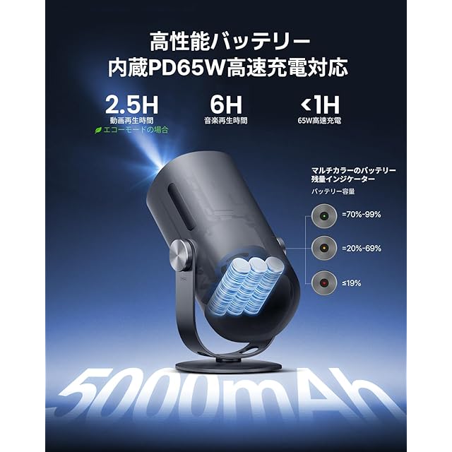 スーパーポータブルシネマ:自由に出かけよう!1回の充電で2.5時間の映画鑑賞や、一晩中音楽を聴きながらのパーティーが楽しめます。USB-C PD65W高速充電対応で充電に困ることはない!注:PD65W以下のスペックに対応しません。
