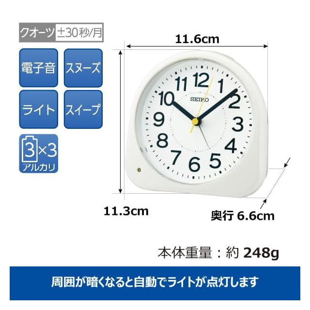 商品名:セイコークロック 目覚まし時計 置き時計 アナログ 夜でも見える 白 113×116×66mm KR525W