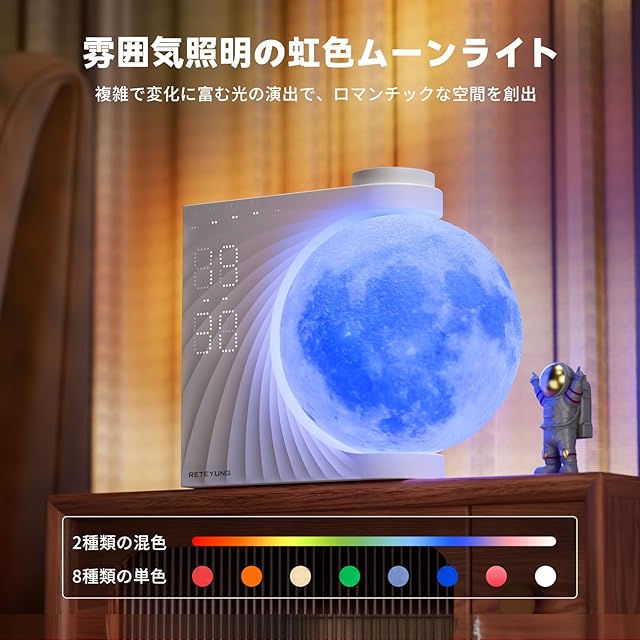 商品名:月ライト 光目覚まし時計 間接照明 おしゃれ ベッドサイドランプ 目覚ましライト 置き時計 8色 RGB タイマー付きの10種自然音 3級明るさナイトライト 夜間照明 授乳灯 女性 人気 誕生日プレゼント 寝室の装飾 インテリア
