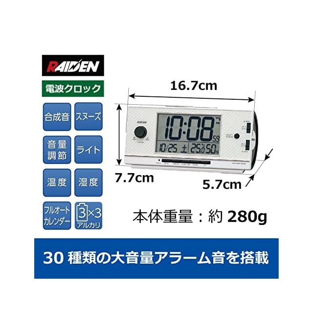 電波修正機能(40kHz/60kHz自動選局・受信OFF機能つき)、大音量電子音アラーム(30パターン)
