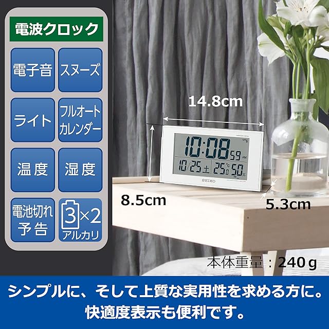 商品名:セイコー クロック 置き時計 目覚まし時計 電波 デジタル カレンダー 快適度 温度湿度表示 01:白パール 本体サイズ:8.5×14.8×5.3cm BC402W