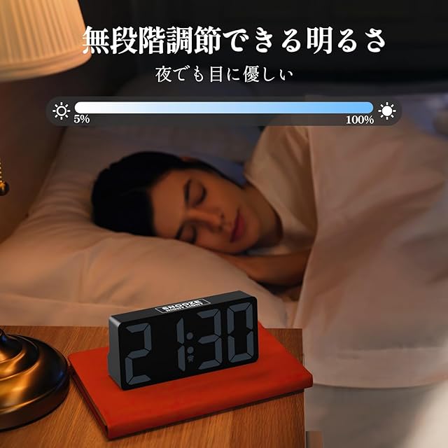 【明るさ調整と音量調節】置く場所により、画面の輝度は5~100%無段階調整でき、光に敏感する方にも使えます。音量70dBから118dBまで7段階調節可能、アラーム音が小さすぎで遅刻したり、うるさすぎて家族に困らせたりすることは心配いりません。大きい数字で、遠くからでもはっきり見えます。子供でも操作しやすく、プレゼントとしてはオススメ!