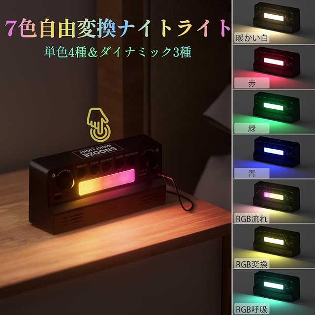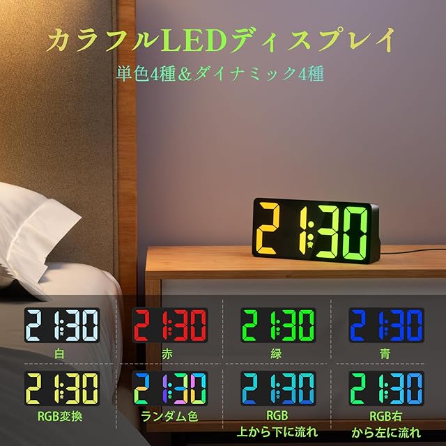 【8色ディスプレイ&7色ナイトライト】ledディスプレイを採用し、単色4種+ダイナミック4種、お好きな色を選択できます。暖かい白-赤-緑-青-RGB 流れ-RGB 変換-RGB 呼吸の順で7色変換ライトを搭載、カラースタイルが自由に調整でき、雰囲気満点になる!時計のデジタル表示とライトは多色調節可能のため、目覚ましとしてだけでなく、インテリアとしても使えます。