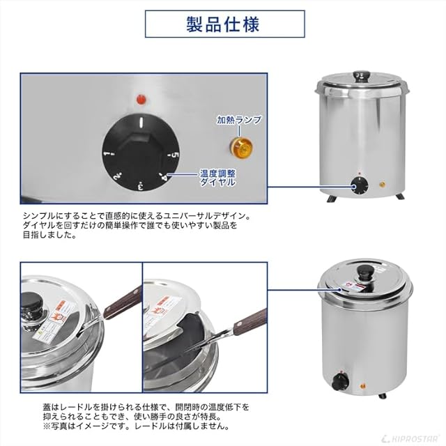 KIPROSTARの業務用スープジャーは本体のなべ底にお湯を入れる関節保温タイプの為(湯煎式)焦げ付きの心配がなく保温が可能です。<br>料理が少量になっても設定温度をキープし、煮つまりも抑え準備や後片づけも簡単でなおかつポットが高級ステンレス製で衛生的です。<br><br> 電源をOFFにする時は温度調整ダイヤルを「0」の位置へ合わせてください。<br> 本体の周囲は10cm以上隙間を空けて風通しを良くしてください。<br> 直射日光やガスコンロ、レンジ等の熱源の近くに設置しないでください。空焚きはしないでください。<br> ※ポット直火不可<br> ※傾いた場所や不安定な場所に設置しないでください。<br>※保存用としてはご使用頂けません。