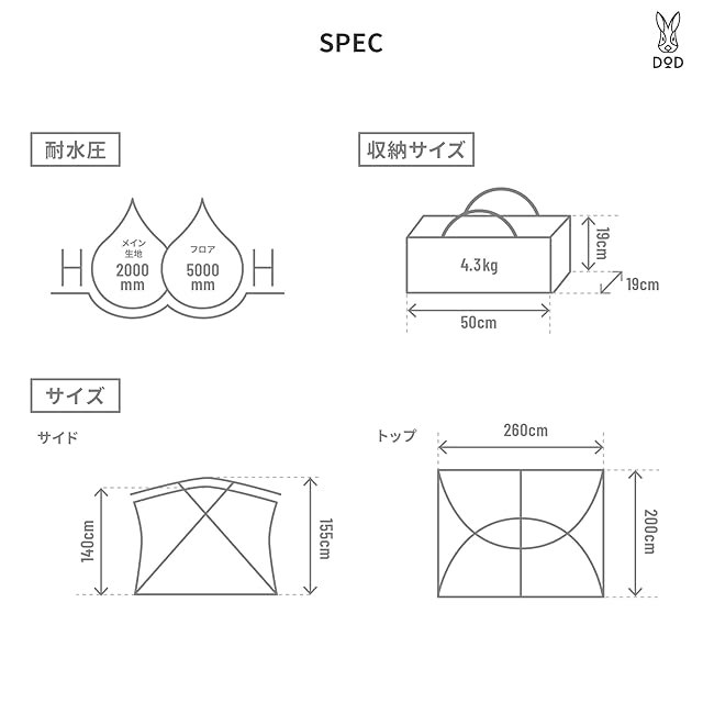 材質:メイン生地:75Dポリエステル(PUコーティング、UVカット加工、遮光コーティング)、 フロア生地:150Dポリエステル(PUコーティング)、ポール:アルミ合金
