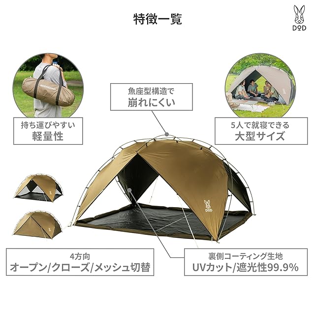 DOD(ディーオーディー) ノドグロシェード 5人用 大型サンシェード UPF50+ 軽量&コンパクト フルクローズ フルメッシュ TT5-163-BR
