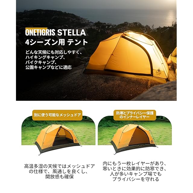【オールシーズンに対応しやすい】OneTigris 4シーズン対応 軽量テント。20D片面コーティングシリコンナイロンを使用し、軽量で防水性が高い。耐水圧3000mm、突然の大雨や梅雨シーズンなど、アウトドアの変わりやすい天気は対応しやすい。二重扉の対流設計、メッシュドアあり、蚊の侵入を恐れなく、通気性と保護性があります。アウターフライは耐風性があり、風や寒さが気にならない冬でも安心