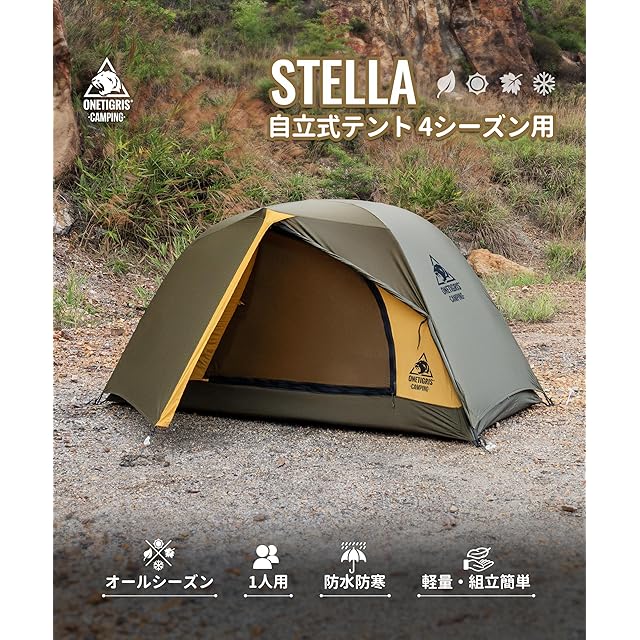 商品名:OneTigris STELLAテント ドームテント 自立型 1人用 広々とした空間 耐水圧3000mm 4シーズン対応 前室あり 快適 軽量 コンパクト収納 215cm x 95cm x 105cm キャンプ ツーリング用
