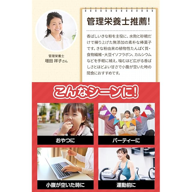 ✅【管理栄養士推薦】香ばしいきな粉を主役に、水あめと砂糖だけで練り上げた無添加の素朴なお菓子です。きなこ由来の植物性たんぱく質、食費繊維、大豆イソフラボン、カルシウムなどを手軽に補え、噛むほど広がる香ばしさとほど良い甘さで小腹が空いた時の間食におすすめです。