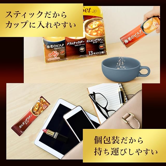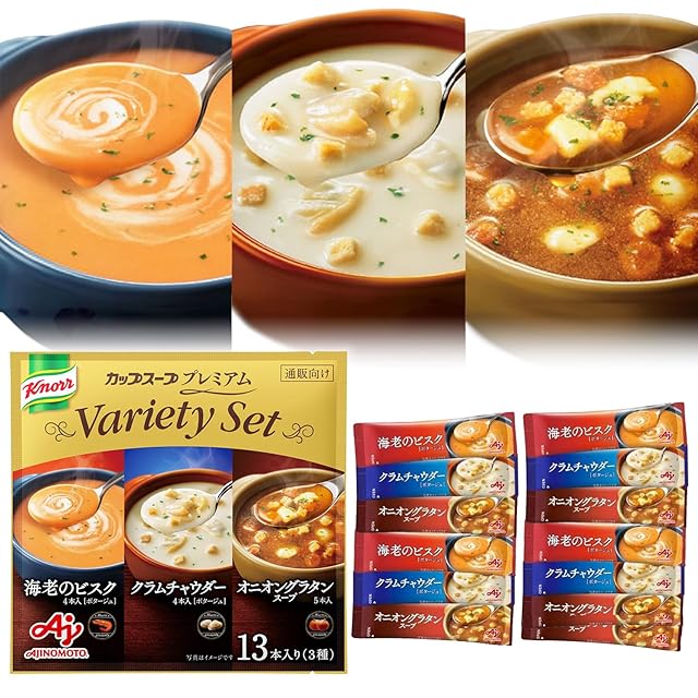 商品名:クノール カップスープ プレミアム 3種13本入 アソート 詰め合わせ スティック 海老 ビスク クラムチャウダー オニオン 贅沢野菜