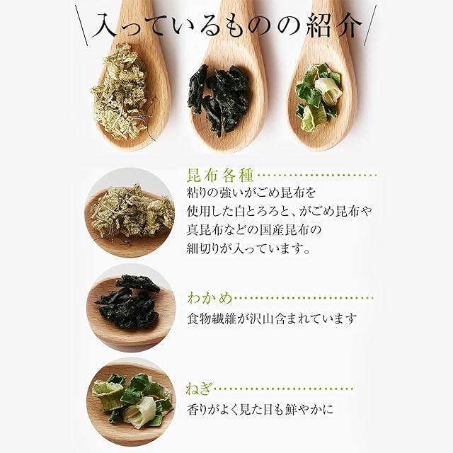 原材料:食塩(国内製造)、乾燥わかめ、昆布(国内産)、ねぎ、がごめ昆布(北海道産75%使用)、砂糖、たん白加水分解物、野菜エキスパウダー、鰹節粉末、椎茸粉末、昆布粉末、粉末醤油、醸造酢/調味料(アミノ酸等)、甘味料(甘草、ステビア)(一部に小麦、大豆を含む)