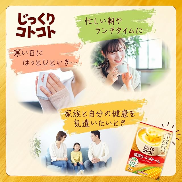 コーン:コーンがたっぷりとけこんだ、濃厚クリーミーなコーンポタージュ。上品な甘みと なめらかなくちあたりで、素材のおいしさをまるごと味わえます。