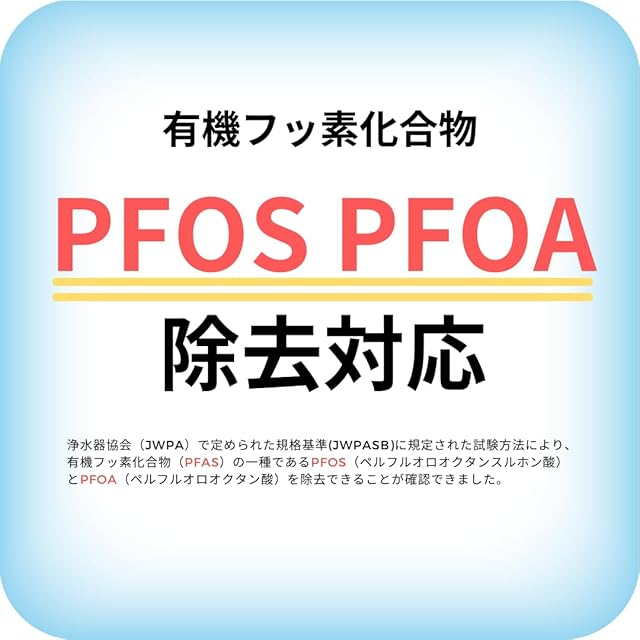 【PFOS/PFOA除去対応】浄水器協会(JWPA)で定められた規格基準(JWPASB)に規定された試験方法により、有機フッ素化合物(PFAS)の一種であるPFOS(ペルフルオロオクタンスルホン酸)とPFOA(ペルフルオロオクタン酸)を除去できることが確認できました!