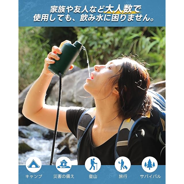 アウトドアや災害対策:家庭のキャンプ、旅行、災害や断水などの緊急時に、川の水やため池、泥水でも、安心して飲める透き通った清潔な飲料水にろ過することができます。