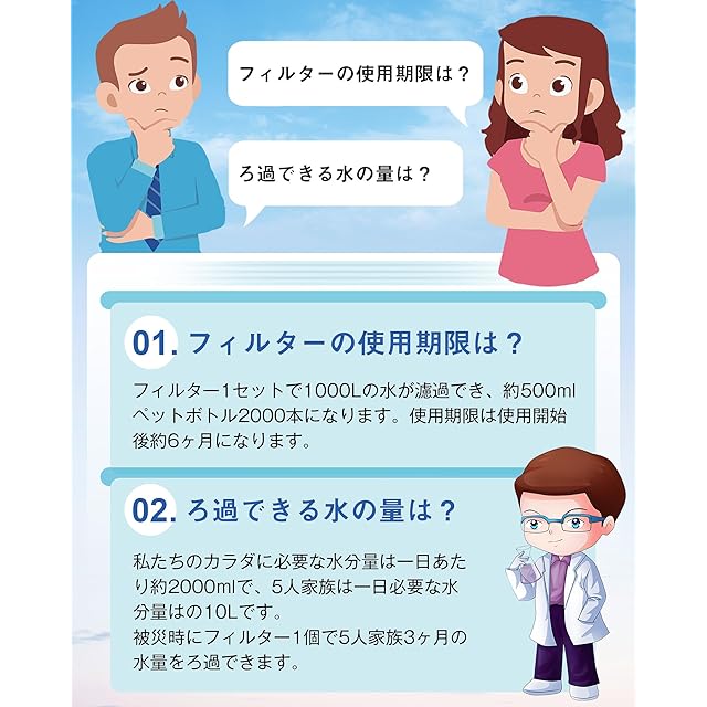 交換簡単&長寿命:使用済みのフィルターを取り外し、新しいフィルターと交換するだけです。連続ろ過水量1000リットル!より安心でより安全に使用することができます。使用期限:使用開始後、約6ヶ月。(あるいは浄水器の総使用容量が上限に達している場合)注:水に含まれる電解物質(カルシウム、マグネシウム)などの有益成分は除去しません。