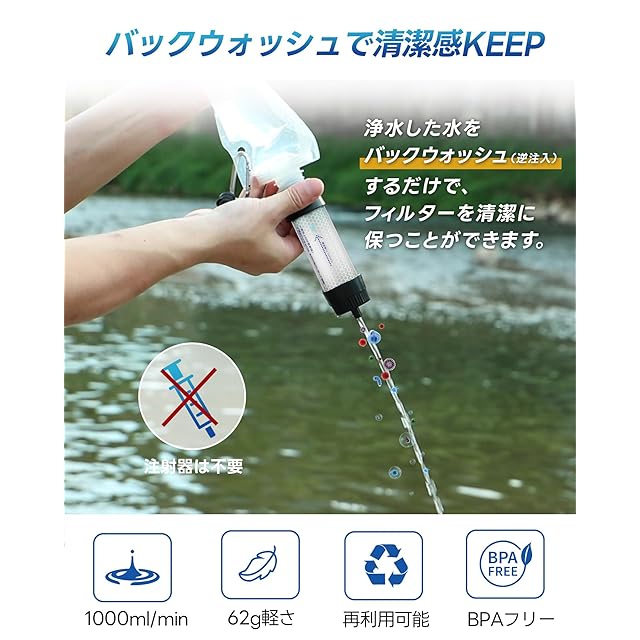 【日本企業による企画・開発・管理&セット内容】携帯型浄水器本体×1、給水バッグ×1、吸水用チューブ×1、緊急用ホイッスル×1、日本語取扱説明書×1がセットになっています。最高水準の99.9999%の除去率を誇る携帯浄水器は、日本企業による企画・開発・管理が行われ、製品ごとに丁寧な管理と検査が徹底されています。ご購入日から12月以内に、製品本体に不具合等が生じた場合は、商品の交換あるいは返金処理等、各種対応を致しますのでご注文番号を添えて販売店までご連絡してお願いいたします。