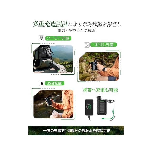 【ソーラー蓄電+手回し充電+USB入力&緊急防災機能を搭載】GS-2811電動浄水器はアウトドアにぴったりな太陽光蓄電ができるほか、付属の専用充電ケーブルからでもスマホへ緊急用充電できます。さらに、手回し充電も対応可能で、ハンドルを回して発電し、停電や浄水器の電源が切れた場合でも、手回し発電とソラーパネルにより浄水器を緊急時に使用できます。どこでもいつでも清潔な水を濾過できます。4つのLED残量ランプにより、バッテリー残量と蓄電状況が確認できます。(※ソラーパネルと手回し充電では、満タンになるまでかなり時間がかかるため、普段なら、USBから充電することをおすすめさせていただきます。)