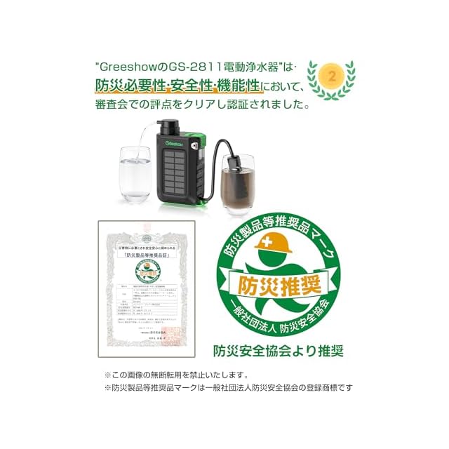 【災害時の必需品、飲用水・生活用水の確保に!】大規模地震等の災害発生時、水道インフラがダウンすると、地下の貯水槽の水を活用することもあります。しかし、貯水槽も地震の影響でトラブルを起こし、水が濁ってしまうことがあります。そこで、Greeshowの新製品、GS-2811電動浄水器が役立ちます。この製品は「移動可能な浄水場」の機能を果たし、濁った水でもろ過可能で、川や湖の水を飲用に適した清潔な水に変換します。特に、GS-2811電動浄水器はコンパクトで持ち運びが容易で、汎用電源に対応しているため、災害時でも迅速に設置・稼働させることができます。さらに、手回し充電とソーラー充電機能も備えています。停電や浄水器の電源が切れた場合でも、手回し発電とソーラー充電機能により浄水器を緊急時に使用できます。どこでもいつでも清潔な水を濾過できます。また、GS-2811電動浄水器はスマートフォンの充電機能も搭載。3000mAhのバッテリー容量により、スマートフォンの電力が低下した緊急時に携帯電話を充電することができます。Greeshowの携帯浄水器は、厚生労働省の水質基準を満たすように水質検査を行い、その結果は水質検査成績書により証明されています。除去率は驚異的な99.9999%で、これは国内の水質検査機関により実証済みです。また、防災士の認定・推奨も受けている信頼性の高い製品です。Greeshowの携帯浄水器及び交換用フィルターは、厳格な品質テストを実施しています。さらに、日本語の説明書・書も付属し、1年間のメーカー制度も完備しています。安心してお試しいただけます。