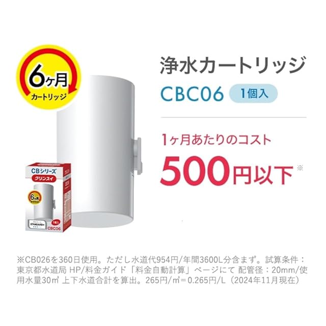 付属カートリッジ:CBC06×1個、ろ材交換目安:1800L、6ヶ月(1日10L使用の場合)