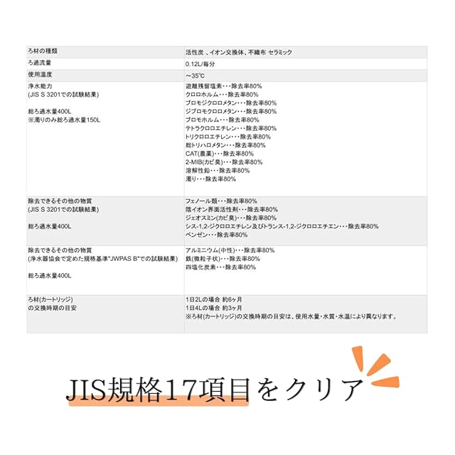 【PFOS及びPFOA除去試験(※)結果と追加項目】 ・PFOS・PFOA … 総ろ過水量400L(除去率80%) JWPAS B試験結果 ・イプフェンカルバゾン … 除去率99% 自社試験結果 ・ホスチアゼート … 総ろ過水量380L(除去率95%) 自社試験結果 ※浄水器協会(JWPA)で定められた規格基準(JWPAS B)に規定された厳格な試験方法によるものです。