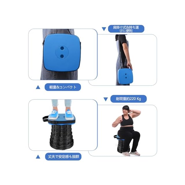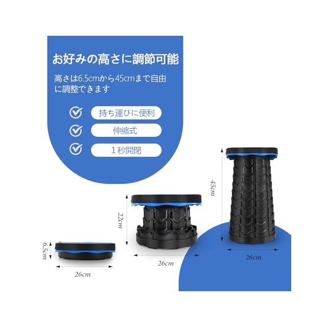 仕様<BR> 品名:折り畳み椅子<BR> 材質:pp材質 重量:1.15kg<BR> 耐荷重:220kg<BR> 高さは:6.5cm-45cm<BR> 組み立てサイズ:幅26cm**高さ45cm<BR> 折りたたむサイズ:幅26cm*高さ6.5cm<BR> セット内容<BR> アウトドア折り畳み椅子*1<BR> クッション*1<BR> 日本語説明書*1 <BR> 用途<BR> 伸縮式スツール<BR> キャンプ<BR> 釣り<BR> 体育会<BR> 山登り<BR> 花見<BR> 運動会<BR> 観戦<BR> フェス<BR> 室内屋外<BR> 使用中のご注意<BR> この椅子を使用する前に、バックルが所定の位置にロックされていることを確認してください。<BR> 雨や雪に濡れた場合は、拭いて乾かしてください。<BR> 屋外で使用したときに汚れた場合は、洗って乾かしてから保管してください。<BR> 保管時は直射日光を避けてください。<BR>