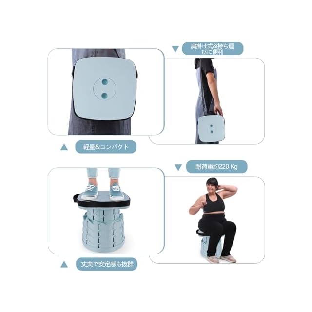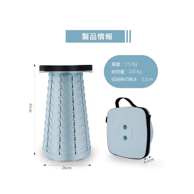 仕様<BR> 品名:折り畳み椅子<BR> 材質:pp材質 重量:1.15kg<BR> 耐荷重:220kg<BR> 高さは:6.5cm-45cm<BR> 組み立てサイズ:幅26cm**高さ45cm<BR> 折りたたむサイズ:幅26cm*高さ6.5cm<BR> セット内容<BR> アウトドア折り畳み椅子*1<BR> クッション*1<BR> 日本語説明書*1 <BR> 用途<BR> 伸縮式スツール<BR> キャンプ<BR> 釣り<BR> 体育会<BR> 山登り<BR> 花見<BR> 運動会<BR> 観戦<BR> フェス<BR> 室内屋外<BR> 使用中のご注意<BR> この椅子を使用する前に、バックルが所定の位置にロックされていることを確認してください。<BR> 雨や雪に濡れた場合は、拭いて乾かしてください。<BR> 屋外で使用したときに汚れた場合は、洗って乾かしてから保管してください。<BR> 保管時は直射日光を避けてください。<BR>